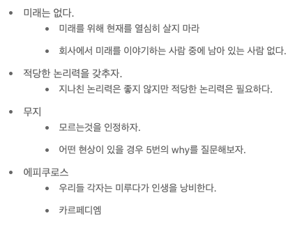 위의 내용들은 현재 시점에 나에게 정말 필요했던 말들이다. 우연히 보게 된 글이지만 좋은 새미나 내용을 정리하신 이동욱님에게도 감사를 표하고 싶다. 참 대단한 개발자이신것 같다. 꼭 마음 한 곳에 새겨놓아야겠다.