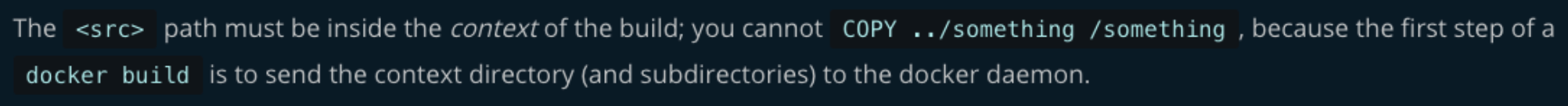 이때 build라는 명령어를 microservice이라는 디렉토리에서 실행했기 때문에 .가 가르키는 context는 microservice 디렉토리 내부가 됩니다. 즉, docker build 명령어를 실행한 시점의 현재 디렉토리가 context가 되게 됩니다. docker build 문서에서도 아래와 같이 COPY <src> <dest>를 사용할 때 src는 반드시 build의 context 내부에 있어야 한다고 합니다.