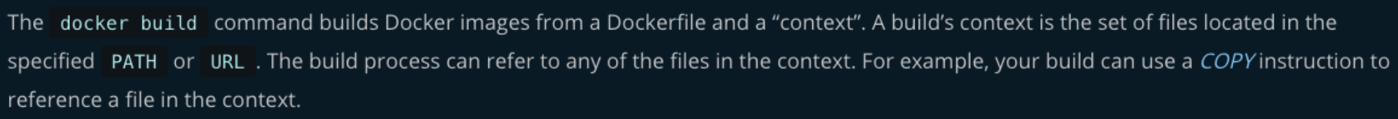즉, docker의 image를 build하려면 Dockerfile과 context가 필요하다고 합니다. 그리고 COPY 지시자는 context 내부의 파일을 참조할 수 있습니다. 한마디로 context 위치가 잘못 정해진다면 COPY를 못하는 상황이 올 수 있다는 것입니다.