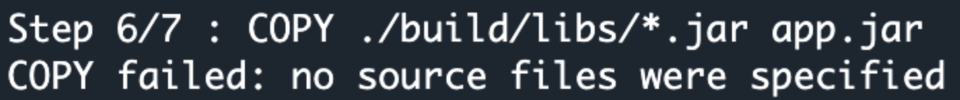 이때 COPY failed: no source files were specified가 발생하게 됩니다. 이처럼 COPY 시점에서 docker build 명령어를 실행한 디렉토리(context)에서 파일을 찾지 못해서 발생하는 에러가 됩니다.