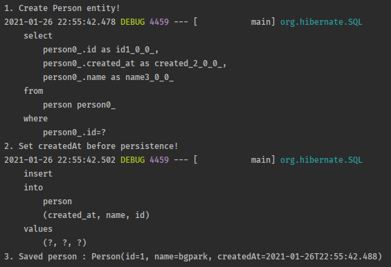 마지막 실행코드에서 Person 객체를 생성할 때, createdAt없이 생성하였습니다 (new Person(1L, "bgpark")). 하지만 데이터베이스에 저장이되면서 createdAt이 추가되었음을 알 수 있습니다.