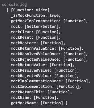 앞서 살펴본 play라는 함수처럼 Video라는 클래스도 똑같이 mockReturnValue 등의 메소드를 가지고 있습니다. 여기서 알 수 있는 것은 jest.mock()으로 감싸지 모든 mock 객체, 그 내부의 함수들은 모두 똑같은 메소드들을 가지고 우리가 컨트롤 할 수 있게 됩니다.