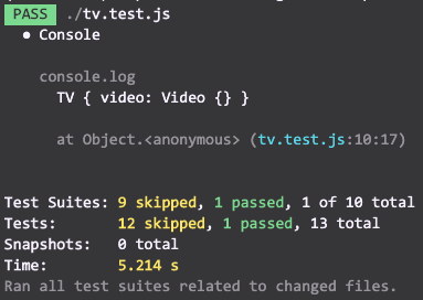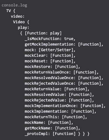 });결과를 보게되면 TV라는 인스턴스에 Video 인스턴스가 있고 그의 메소드를 가지고 있는 것을 볼 수 있습니다. video의 play라는 함수는 원래의 기능인 console.log(video)가 아닌 mockReturnValue 등인 jest.mock()이 가지는 함수로 감싸지게 됩니다. 즉, 우리가 마음대로 play라는 함수의 결과를 결정하고 가짜 video의 결과를 조절할 수 있게 됩니다.
