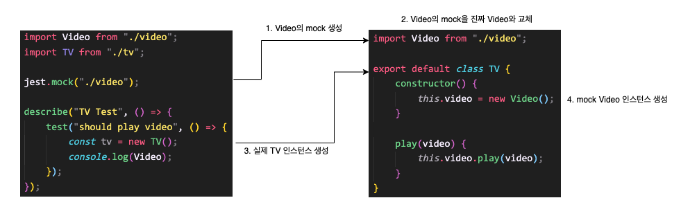 즉, Tv라는 인스턴스가 생성되는 시점 이전에 jest.mock()을 통해 가짜 Video를 Tv 클래스에 주입하게 되는 것입니다.