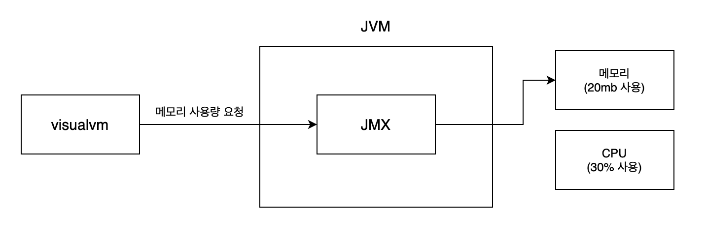JMX는 Java Management Extension으로 모니터링 목적으로 사용되는 프로그램이라고 할 수 있습니다. 앞서 visualvm으로 서비스의 자원을 가져올 때 JMX를 사용한다고 하였습니다. 정확히는 서버의 자원을 숫자로 표현하기 위해서는 visualvm과 같은 클라이언트에서 어떤 자원을 가져와 라는 이벤트를 받으면 서버의 메모리나 cpu 자원의 값을 가져오는 메소드를 사용하게 됩니다. 우리가 흔히 아는 클래스를 생성하고 객체를 생성하여 메소드를 호출하듯 같은 과정을 통해 메소드의 리턴값으로 메모리, cpu 등의 자원 사용량을 받아오게 됩니다.