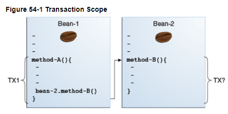 - Client가 트랜잭션을 시작하고 메소드를 실행한다면(T1), 메소드는 클라이언트 트랜잭션 내에서 실행된다. (T1)