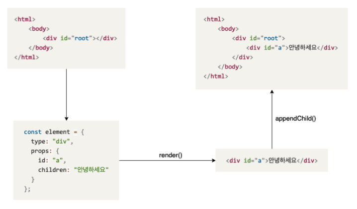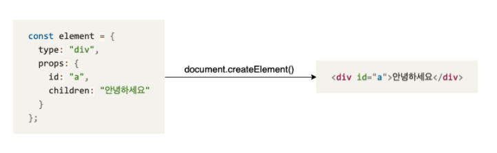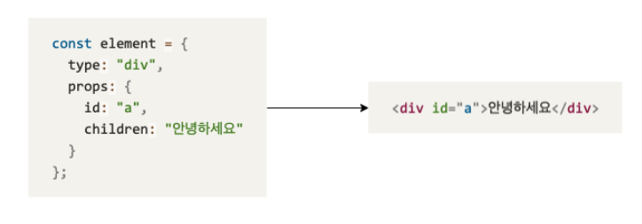 <div id="a">안녕하세요</div>만약 위와 같은 html 태그를 화면에 출력하려면, 리액트는 아래와 같이 element를 만들어 태그를 생성합니다