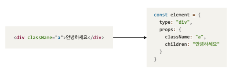 - "div", "a" 혹은 함수가 될 수 있습니다. (함수의 경우는 함수형 컴포넌트를 뜻합니다)