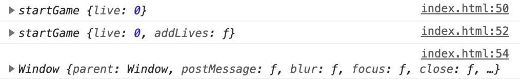 addLives 함수가 먼저 startGame()가 가진 this를 끌어오고, addLives가 끌어온 부모의 this를 oneUp이 사용하는 것을 볼 수 있다.