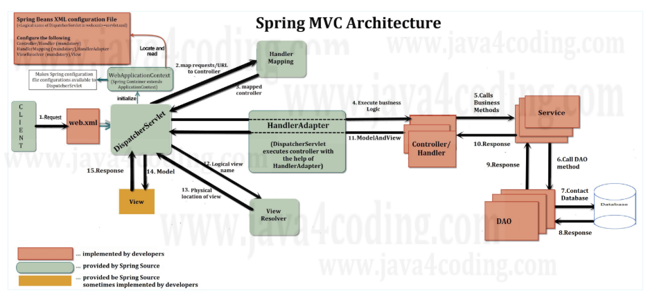 여기서 handler라는 단어가 있는데 여기서는 Controller의 역할로 사용되게 됩니다. 자세한 내용은 이곳을 참조하시기 바랍니다. 통상적으로 handler는 Controller를 포함한 HttpRequestHandler, WebRequestHandler 등과 같이 Dispatcher Servlet과 함께 일하는 것들을 통칭합니다. Controller는 Dispatcher Servlet과 협업하여 web request를 실행하고 view를 반환하기 때문에 handler라고 불려집니다.