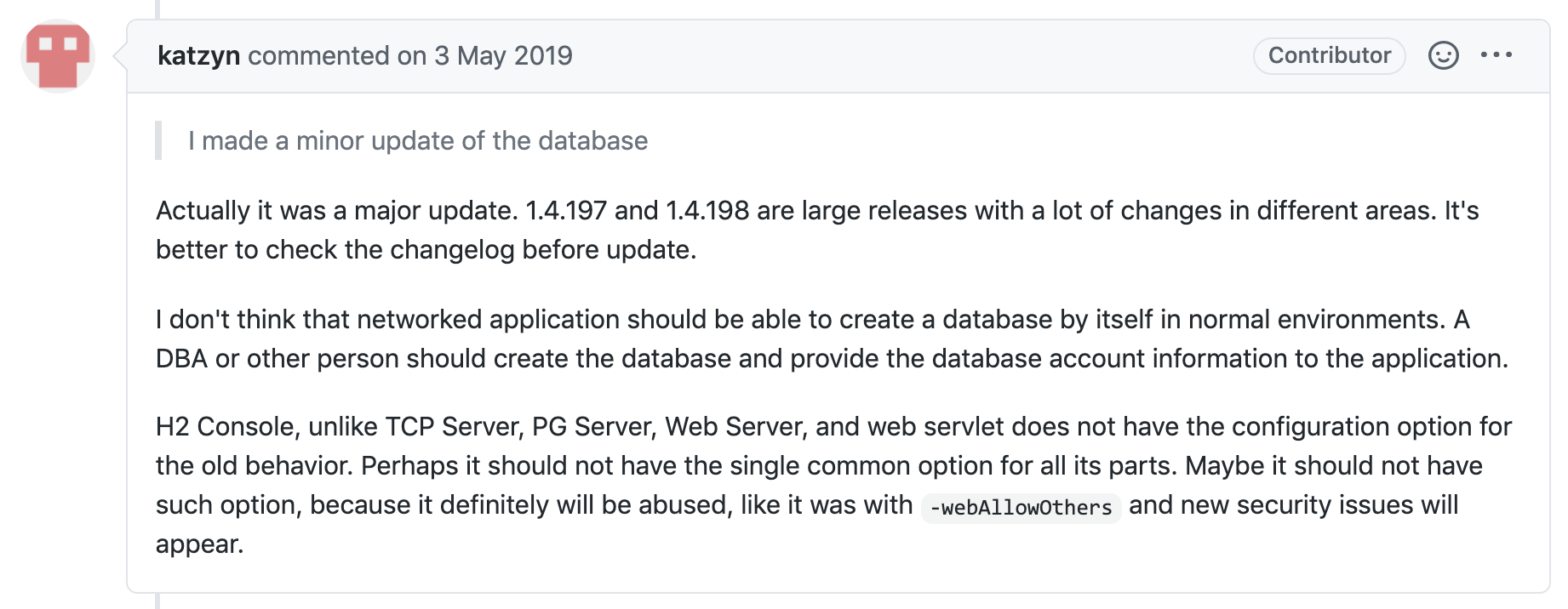 조금 찾아본 결과 이곳에서 문제의 원인을 찾을 수 있었습니다. h2가 1.4.197과 1.4.198버전 사이에 대규모 업데이트가 되면서 데이터베이스를 미리 생성하는 것을 방지하도록 설정되었습니다.