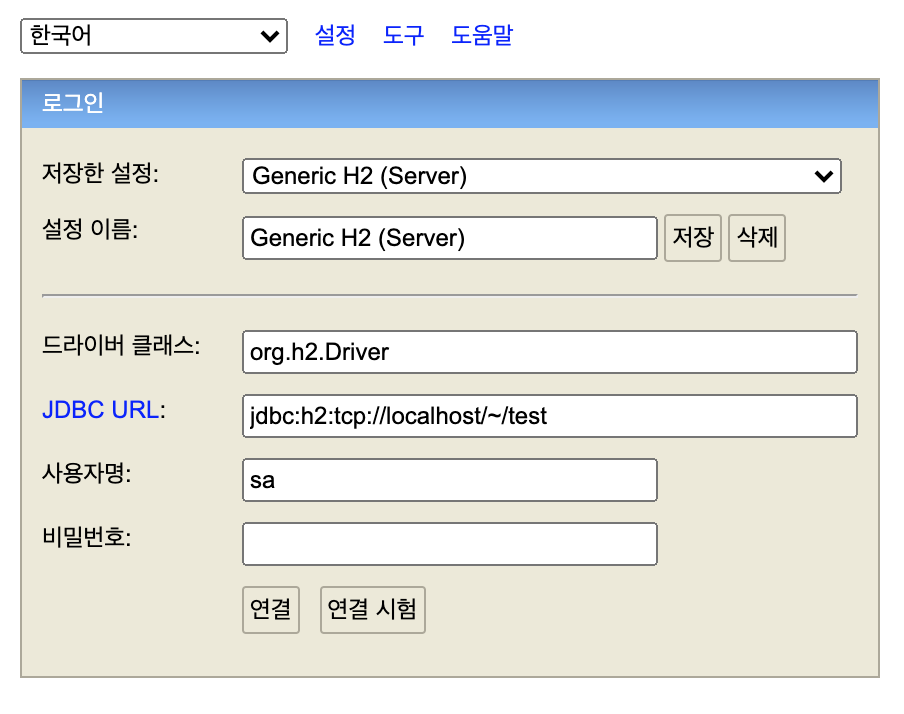 맥을 사용할 경우 test 데이터베이스가 없다는 에러가 생길 경우가 있습니다. 이는 MAC OS 버전이 Catalina인 경우 발생할 수 있습니다. 이 경우 JDBC URL을 jdbc:h2:~/test로 바꿔줍니다. 그리고 접속을 하면 /User/사용자/ 경로 아래 test 라는 데이터베이스가 생성됩니다. 재시작 이후 JDBC URL을 jdbc:h2:tcp://localhost/~/test로 바꾸면 사용가능 합니다.
